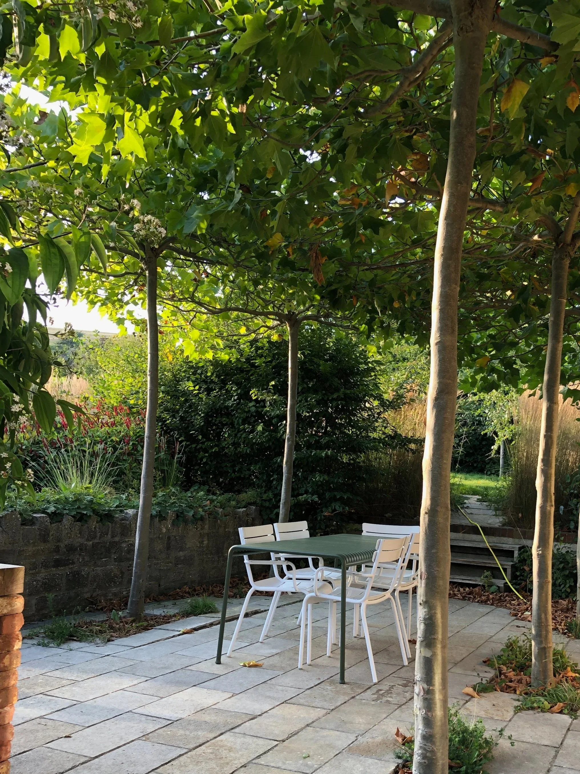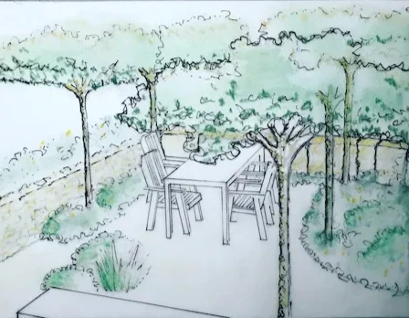 Hand drawn visualisation showing shaded terrace with roof form trees and planting pockets
